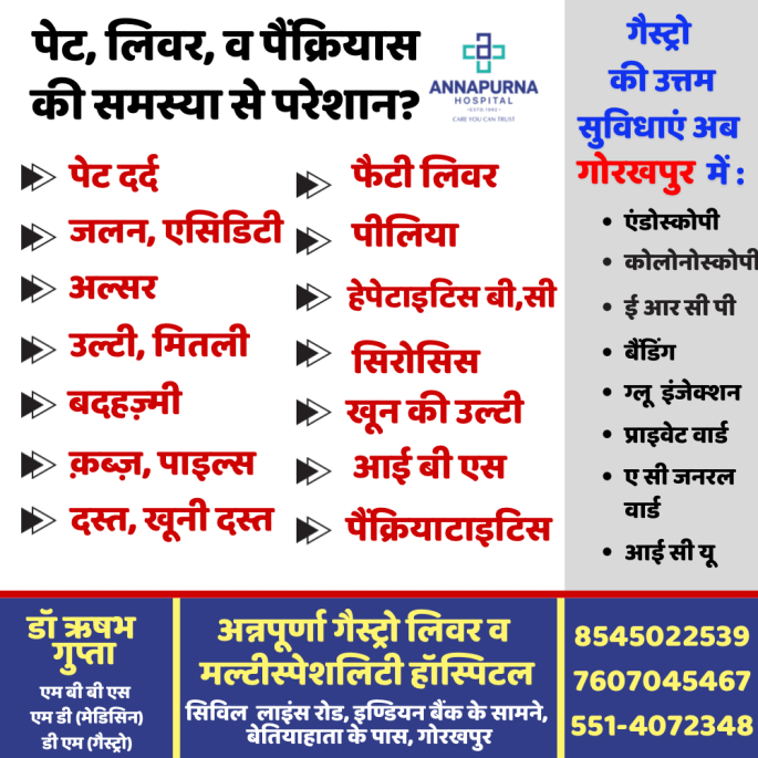 A gastroenterologist specializes in diagnosing and treating disorders of the digestive system, including the stomach, intestines, liver, pancreas, and gallbladder. At Annapurna Hospital, Civil Lines, Gorakhpur, Dr. Rishabh Gupta—widely regarded as the best gastro doctor in Gorakhpur—offers expert care for a range of conditions like: